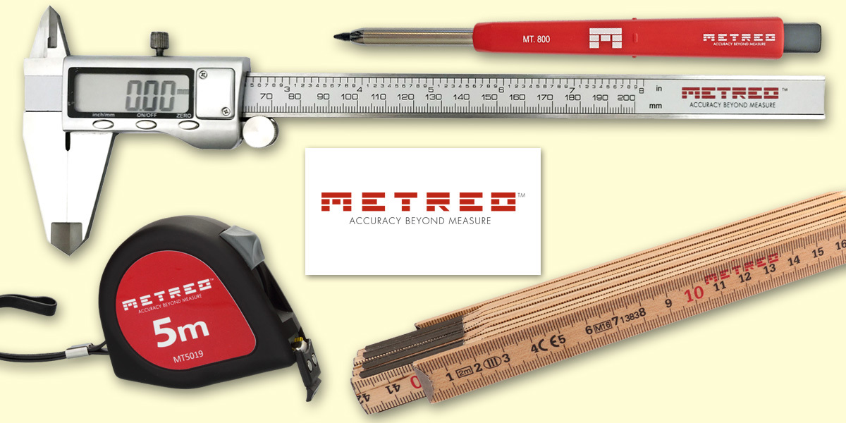Metreo - varumärket som fokuserar på mät- och märkverktyg. Sortimentet innehåller skjutmått, måttband och märkpennor.